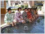 足湯・休憩施設「ポケットパーク」 足湯は、湯温38度。美作地方の巨人伝説で京まで三歩で行き交ったという「三歩(さんぶ)太郎」の足形をモチーフにしたユニークな形です。施設の利用可能な時間は10:00〜19:00(11月〜2月は10:00〜18:00)、どなたも無料でご利用いただけます。